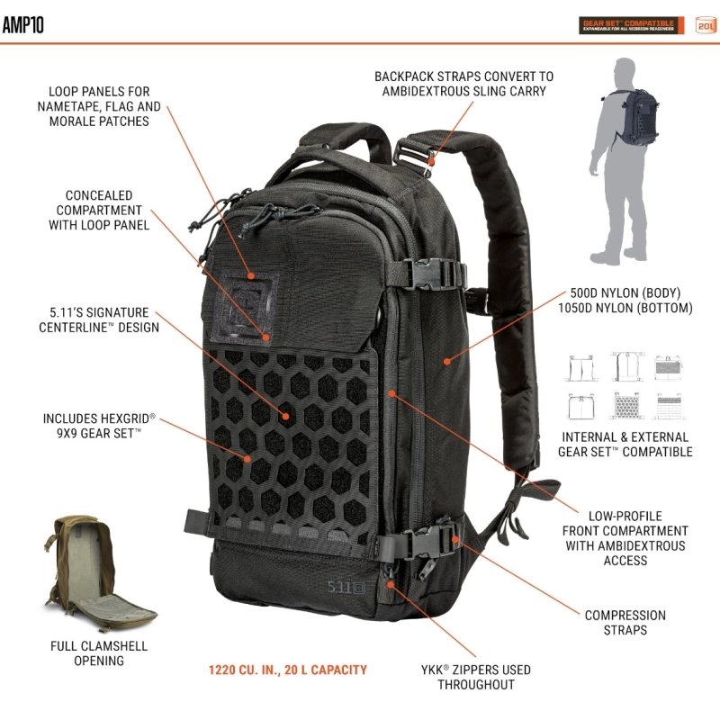 Small but mighty, the AMP10™ Backpack is built to be tough, flexible and comfortable. It offers virtually limitless options for mounting or attaching gear with 5.11's patented HEXGRID® multi-angle load bearing system. This super pack also includes a full-loop platform and webbing loops for internal Gear Set™ placement. It even forms to your body for total support via the thermoformed ergonomic back panel. Removable straps allow for dual backpack carry or single sling carry with crossbody strap. And don’t forget the CCW pocket for your most essential cargo. Explore the AMP collection.