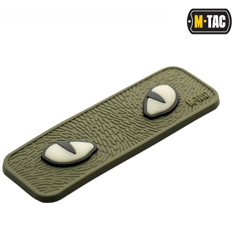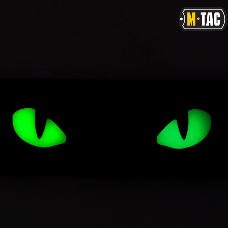 M-Tac Cat Eyes Laser Cut fluorescent - refers to the so-called "Morale patches "- can be attached to a baseball cap or a backpack with velcro - Velcro (Velcro is sewn to the patch itself on the back). The painting is made of a phosphorescent material glowing in the dark. This patch is made of rubber with a 3D relief image.