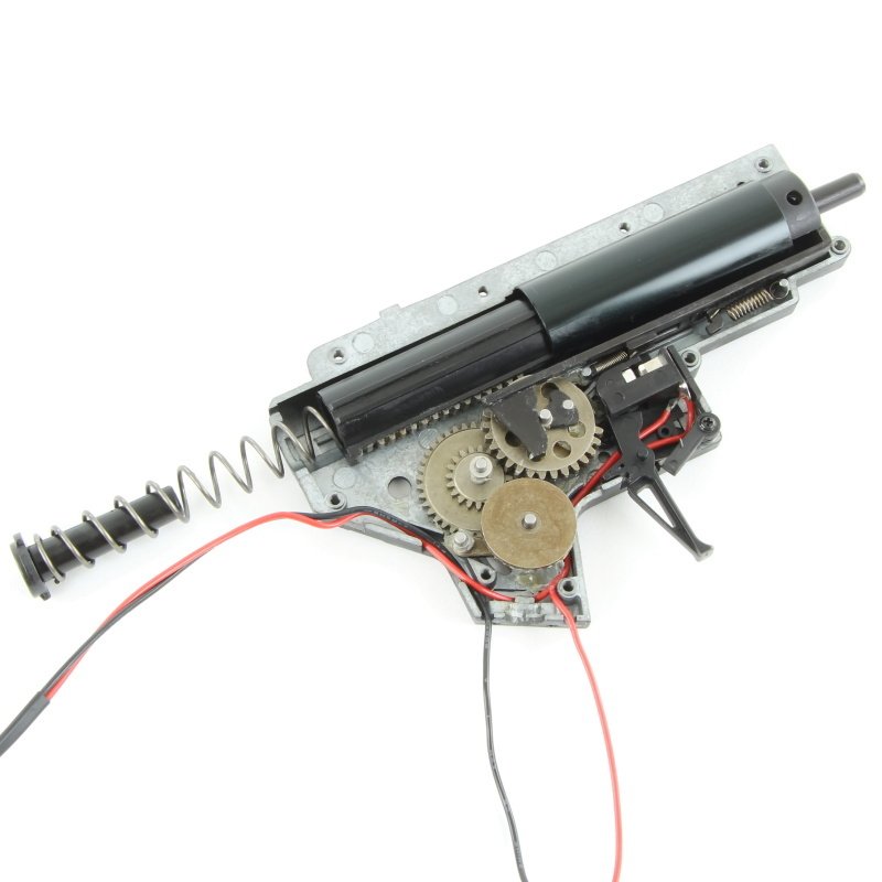 - Reinforced piston with fully metal gearing, delay cam for better bb feed, quick spring change, rotating Hop-up chamber, reinforced gearbox that holds the 120-130 spring for a long time and an accurate 6.03mm barrel