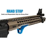 A practical aid serving either as a front grip (hand stop) or as a stop to gain support for the cover/obstacle (barricade rest). This accessory is intended for UTG Super Slim Keymod forearm, but can also be used on slim keymod forearms from other manufacturers (for standard - wide - forearm, the fixing screw is short).