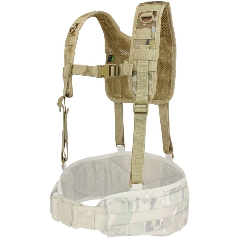 Choose the rugged H-Harness from Condor Outdoor to enjoy convenient access to additional gear and accessories when you're on the go. This unique harness is designed for use with the Battle Belt system. The suspender attachments securely hook into D-rings to provide stable support for the gear on your Battle Belt and help to distribute weight evenly across your torso. At the same time, the Condor H-Harness can be used for additional gear and supply storage. The three rows of webbing along the back and on the shoulder straps offer a convenient way to keep accessories close at hand as you go about your training or your mission. The Condor H-Harness remains comfortable even in harsh conditions thanks to a breathable mesh liner and wide, contoured straps. Wear this versatile harness with Battle Belt suspenders to stay prepared and organized in any situation.