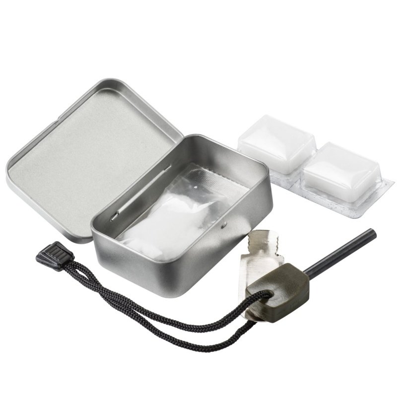 - Set includes: steel survival box (dimensions: 93 x 62 x 27 mm), a fire starter with a striker, two fuel tablets and cotton wool.