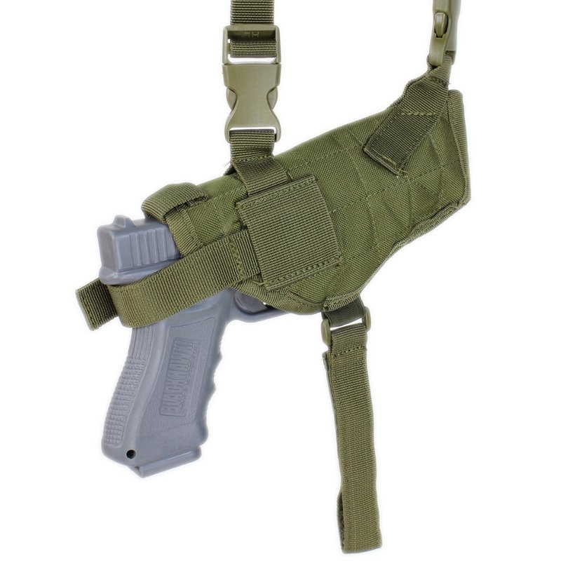 The Universal Shoulder Holster is convenient and comfortable. The universal holster is thoroughly padded for comfort and because it is fully adjustable, it can be fit to virtually any wearer. The holster is black in color and the straps are slim enough to be concealed underneath clothing or a jacket. Belt loops can be used to help keep the holster in place during use. All hardware on the holster is made of plastic for improved safety and comfort.