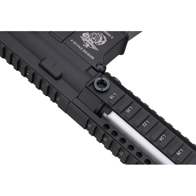 SA-A01 assault rifle replica by Specna Arms is made largely of a uniform zinc and aluminum alloy, reinforced with steel elements in the most vulnerable points of the replica (steel elements - all the screws, pins and tactical sling swivels). Both the SF stock storing the battery and the pistol grip were made of polymer. The receiver of the replica and the RIS handguard have undergone the process of anodizing, which guarantees a high degree of protection against corrosion. The paint was applied via a process of powder coating, after having the surface undergo the process of sandblasting prior to the application of paint. This provides a much higher than usual resistance of the applied paint to abrasion. The receiver bears USMC markings.