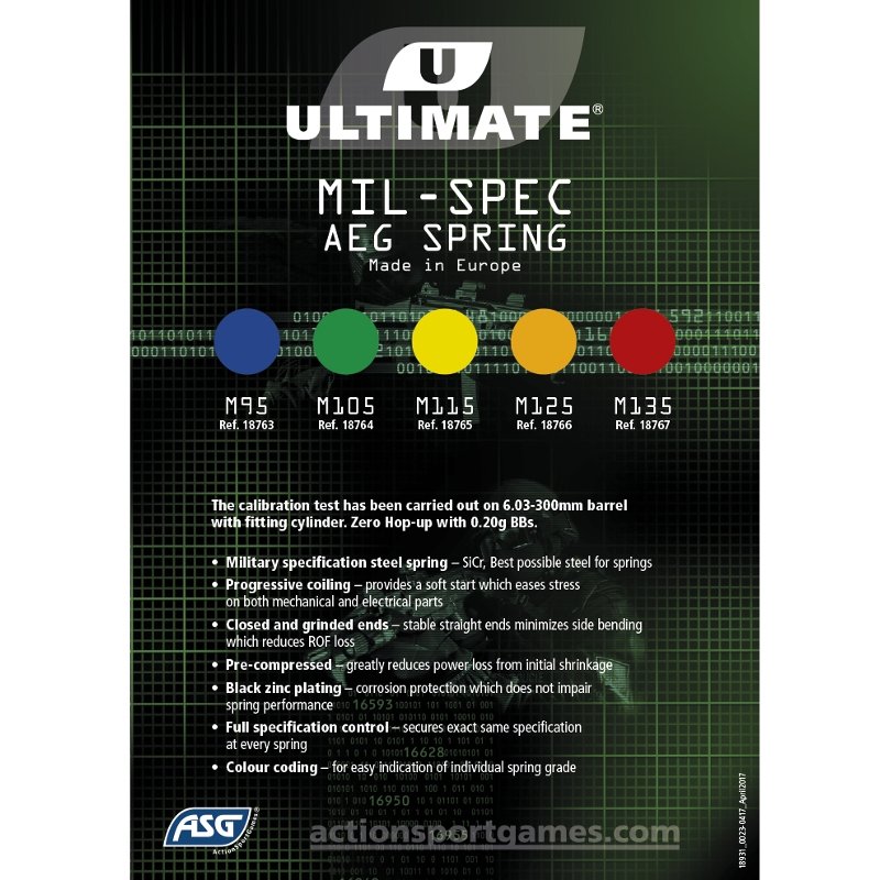 Ultimate Mil-Spec AEG springs are manufactured out of the best steel (SiCr) available for springs. With a minimum loss in power and consistency, the Mil-Spec spring series is the ULTIMATE choice for your AEG. The Mil-Spec springs are colour-coded for better identifying them when changing out the spring for different skirmishes.