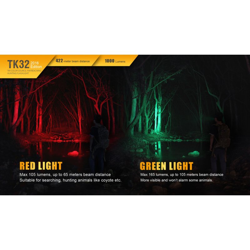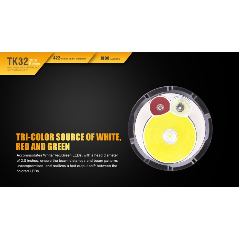 The second generation of the Fenix ​​TK32 flashlight is one of the strongest tactical flashlights on offer, compared to the previous version, the performance of colored LEDs has been significantly enhanced. Its powerful reflector offers an afterglow of up to 422 meters and a luminous flux of up to 1000 lumens (ANSI). A unique advantage are color diodes (red, green) with their own reflectors. The main light source is the most modern Cree XP-L HI V3 LED, the colored light is provided by two Cree XQ-E LEDs. The flashlight can be powered by two CR123A lithium batteries or one 18650 type li-ion battery. The Fenix ​​TK32 LED flashlight has a total of four white light functions with a lifespan of up to 170 hours and four color light modes. At the rear of the lamp is a tactical switch allowing immediate activation by pressing halfway and a second switch which controls the lighting modes. Fenix ​​TK32 2016 Edition is a top lighting tool for professionals and hunters.
