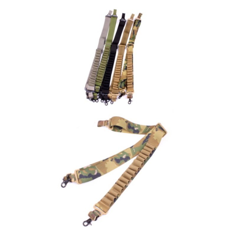 Tactical three-point strap with metal eyelets and sewn-on pockets for cartridges